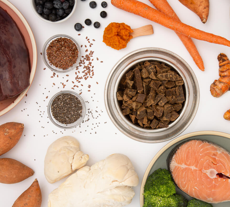 Beef, Beef Heart, Beef Liver, Salmon, Flaxseed, Sweet Potato, Pumpkin, Calcium Carbonate, Carrots, Broccoli, Chia Seeds, Blueberry, Ginger, Salt, Turmeric, Lion’s Mane Mushroom (Hericium erinaceus), Zinc Proteinate, Iron Proteinate, Vitamin E Supplement, Niacin Supplement, Selenium Yeast, Copper Proteinate, Manganese Proteinate, Thiamine Mononitrate, d-Calcium Pantothenate, Pyridoxine Hydrochloride, Riboflavin Supplement, Biotin, Vitamin B12 Supplement, Folic Acid, Calcium Iodate, Vitamin D3 Supplements, Mixed Tocopherols (Preservative)